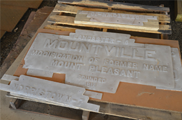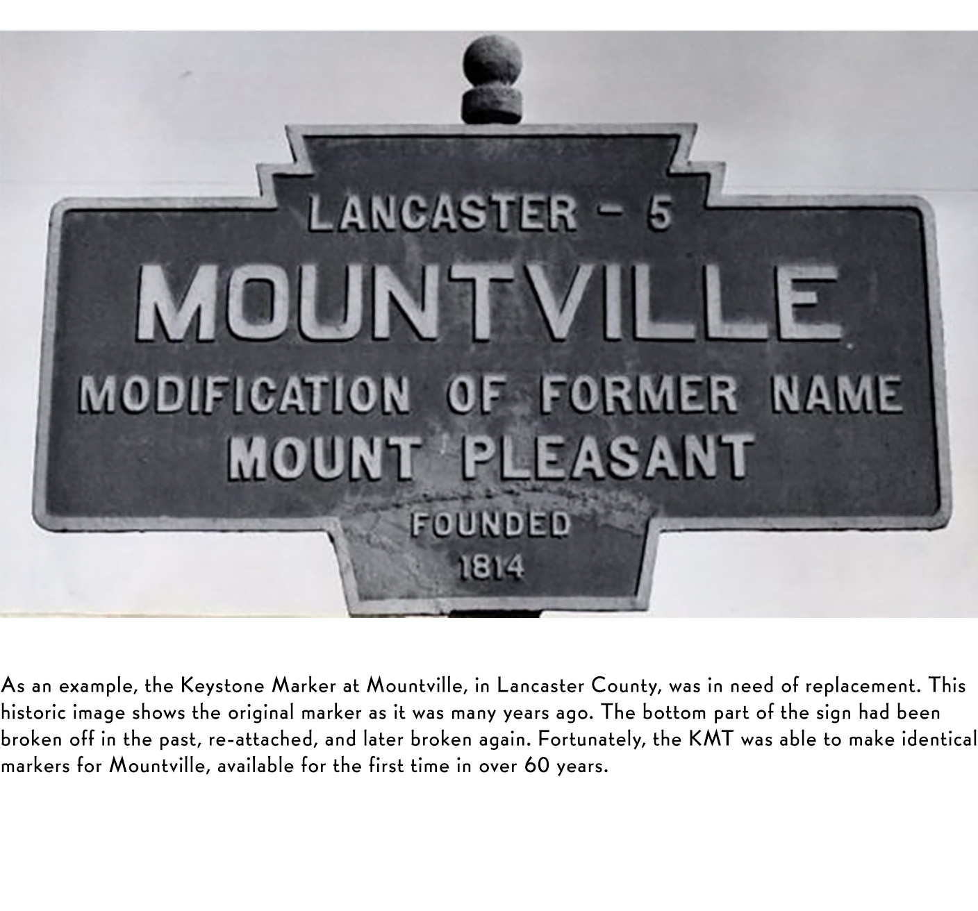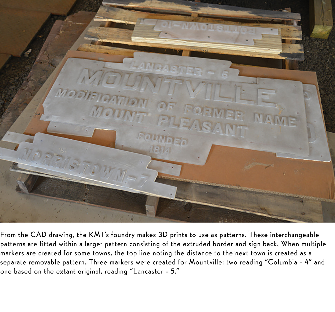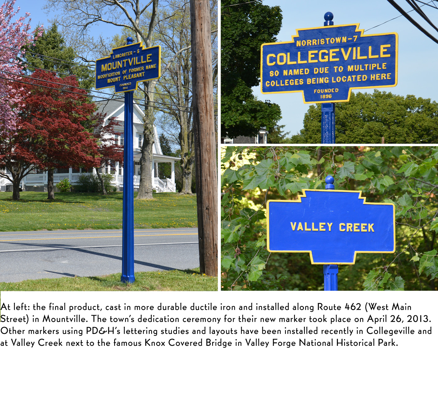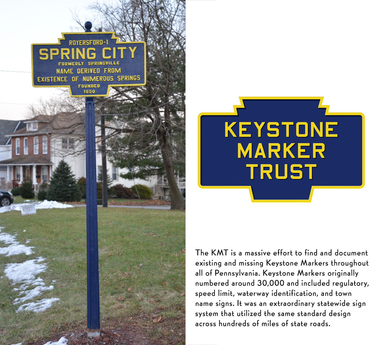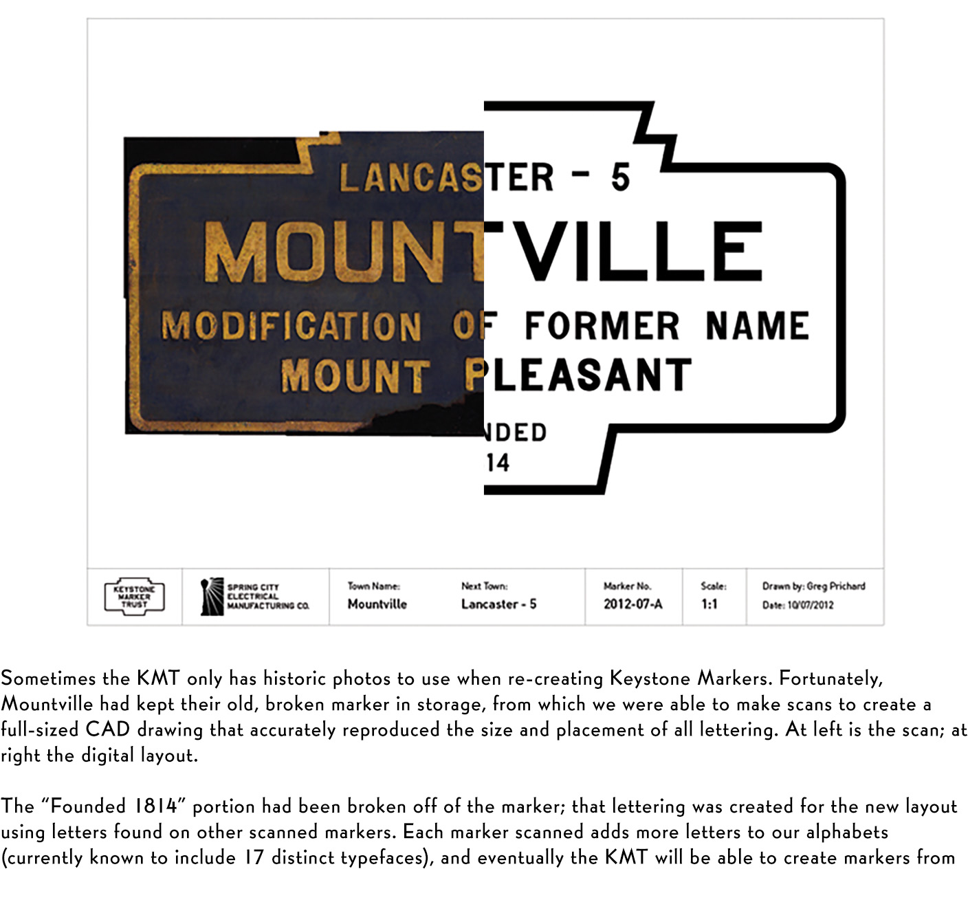 PD&HS consults for the Keystone Marker Trust, an organization dedicated to the preservation and reconstruction of Pennsylvania's iconic Keystone Markers. PD&HS provides the Trust with design support, including the creation of their graphic materials and reproduction of the historic typefaces used on the original 1920s-'40s markers in digital form so that they may be fabricated accurately by modern methods. The images below show the process of creating a new marker, from documentation to fabrication.